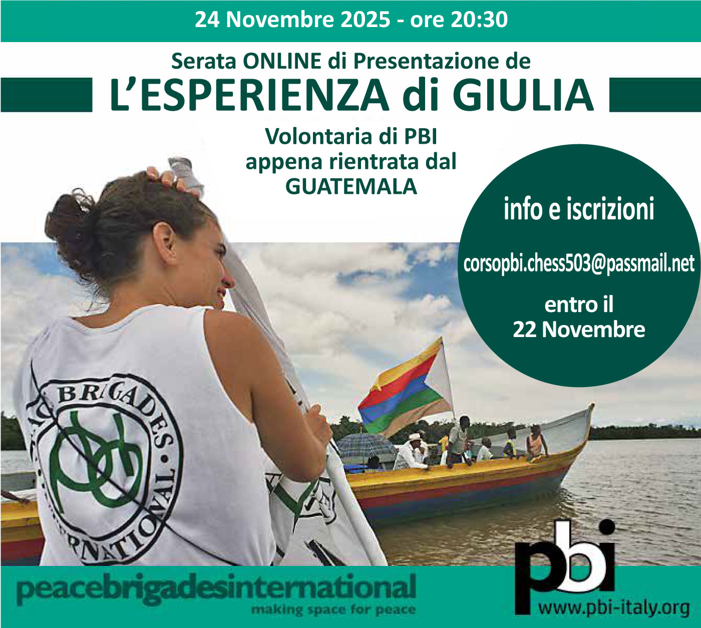 Si terrà il 24 novembre 2025 alle 20.30 la serata-incontro in cui avrete la possibilità di ascoltare una freschissima esperienza sul campo grazie alla testimonianza di Giulia, appena tornata da un periodo di volontariato in Guatemala con Peace Brigades International. Vedi qui il volantino.